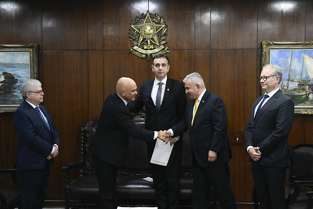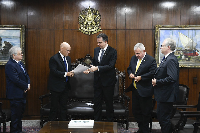 Presidente do Senado Federal, senador Rodrigo Pacheco (PSD-MG), recebe o presidente do Tribunal Superior Eleitoral (TSE) e ministro do Supremo Tribunal Federal (STF), Alexandre de Moraes, que apresenta propostas para serem acrescentadas ao texto do Projeto de Lei (PL) 2.630/2020, que aguarda votação na Câmara dos Deputados.
