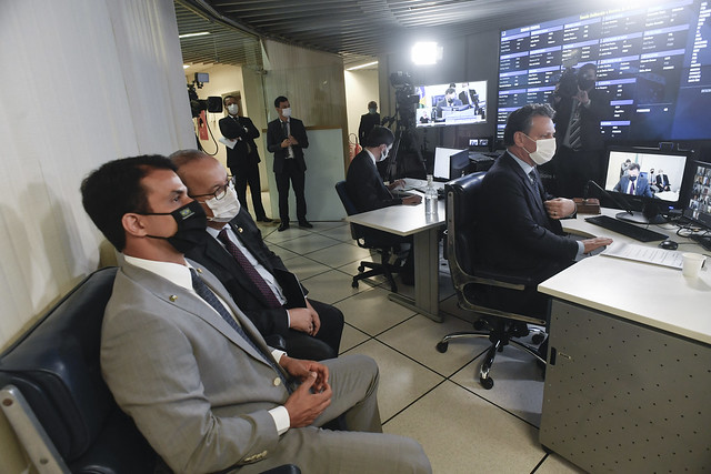 Sessão Deliberativa Remota (SDR) do Senado Federal realizada a partir da sala de controle da Secretaria de Tecnologia da Informação (Prodasen).