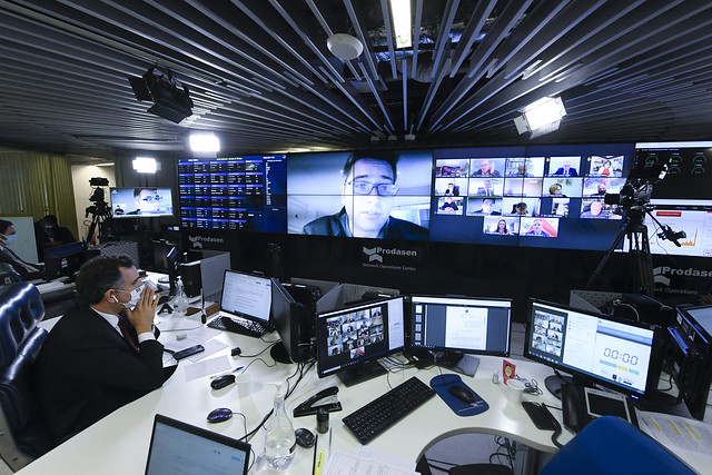 Sessão Deliberativa Remota (SDR) do Senado Federal realizada a partir da sala de controle da Secretaria de Tecnologia da Informação (Prodasen).