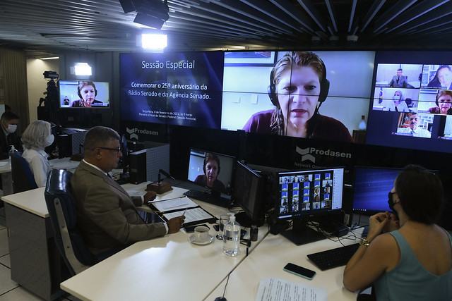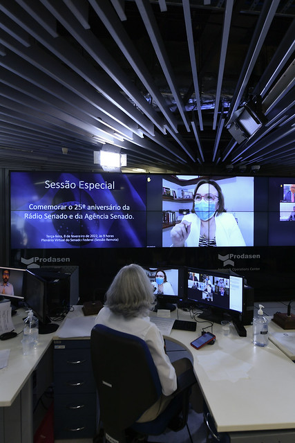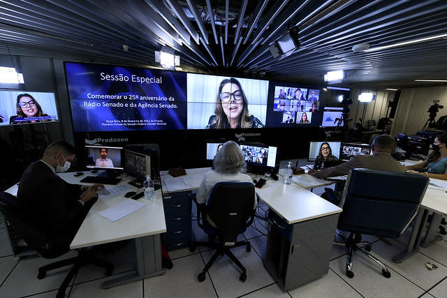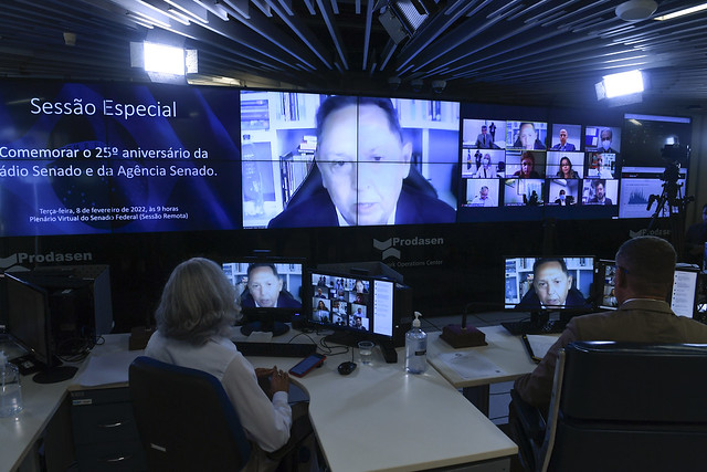 Sessão especial remota, realizada a partir da sala de controle da Secretaria de Tecnologia da Informação (Prodasen), destinada a comemorar o 25º aniversário da Rádio Senado e da Agência Senado.