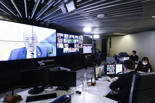 Sessão Deliberativa Remota (SDR) do Senado Federal realizada a partir da sala de controle da Secretaria de Tecnologia da Informação (Prodasen).