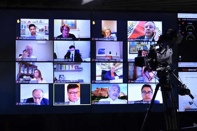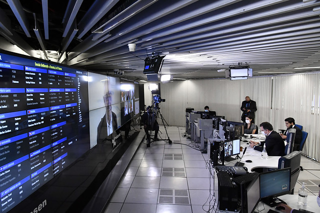 Sessão Deliberativa Remota (SDR) do Senado Federal realizada a partir da sala de controle da Secretaria de Tecnologia da Informação (Prodasen).