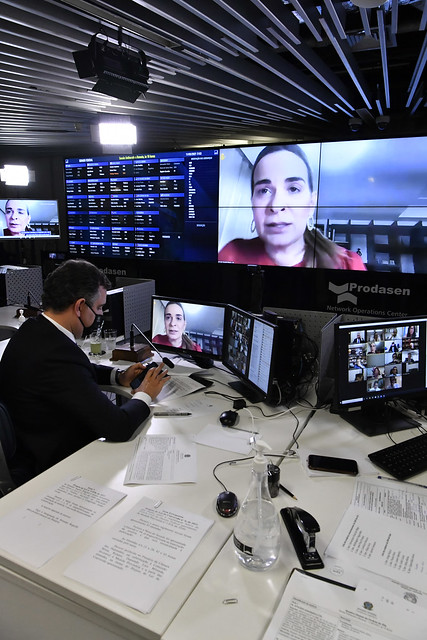 Sessão Deliberativa Remota (SDR) do Senado Federal realizada a partir da sala de controle da Secretaria de Tecnologia da Informação (Prodasen).