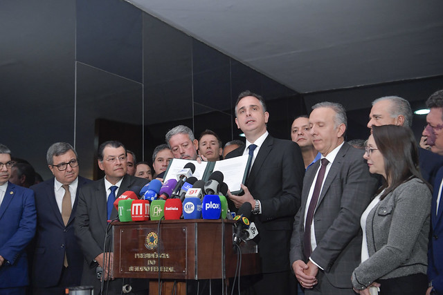 Presidente do Senado Federal, senador Rodrigo Pacheco (PSD-MG), conversa com a imprensa após receber, oficialmente, do presidente da Câmara dos Deputados o texto da PEC 45/2019, que simplifica o sistema tributário do país.
