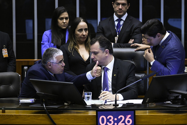 Plenário da Câmara dos Deputados durante sessão conjunta do Congresso Nacional destinada à deliberação dos Vetos nºs 46 e 67, de 2021; 30, 33, 34, 39, 43, 53, 54, 56 a 65, de 2022; e 1 a 7 de 2023; e dos Projetos de Lei do Congresso Nacional nºs 1, 2, 3 e 5, de 2023.