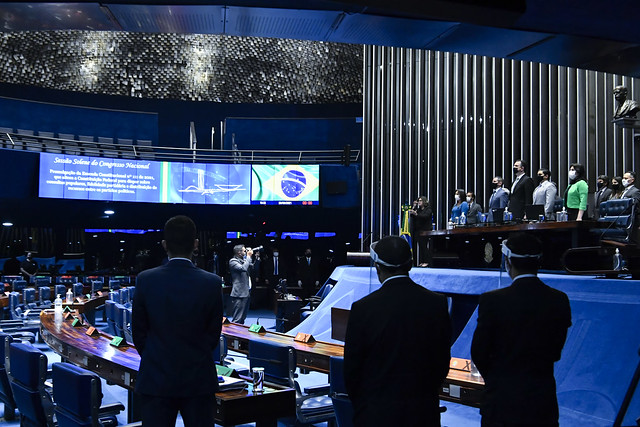 Plenário do Senado Federal durante sessão solene semipresencial do Congresso Nacional destinada à promulgação da Emenda Constitucional nº 111 de 2021, que acrescenta dispositivo ao Ato das Disposições Constitucionais Transitórias e altera a Constituição Federal, para fins de reforma político-eleitoral.