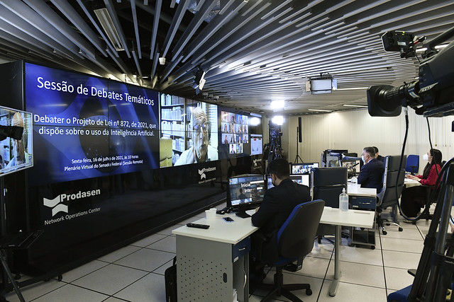Sessão de debates temáticos, realizada a partir da sala de controle da Secretaria de Tecnologia da Informação (Prodasen), para debater o Projeto de Lei nº 872, de 2021, que dispõe sobre o uso da Inteligência Artificial (IA).