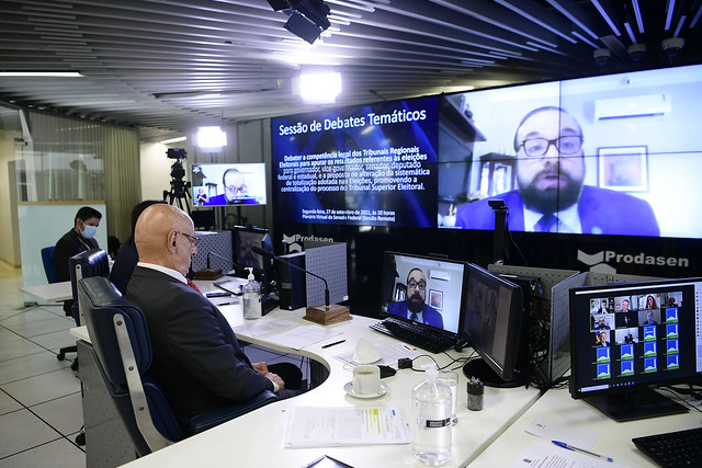 Sessão de debates temáticos, realizada a partir da sala de controle da Secretaria de Tecnologia da Informação (Prodasen), destinada a debater a competência legal dos Tribunais Regionais Eleitorais para apurar os resultados referente às eleições para governador, vice-governador, senador, deputado federal e estadual, e a proposta de alteração da sistemática de totalização adotada nas Eleições, promovendo a centralização do processo no Tribunal Superior Eleitoral.