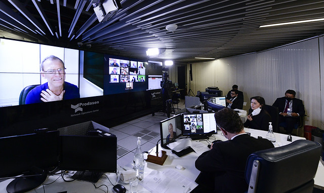 Sessão Deliberativa Remota (SDR) do Senado Federal realizada a partir da sala de controle da Secretaria de Tecnologia da Informação (Prodasen).