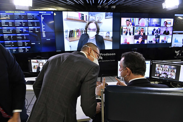 Sessão Deliberativa Remota (SDR) do Senado Federal realizada a partir da sala de controle da Secretaria de Tecnologia da Informação (Prodasen).