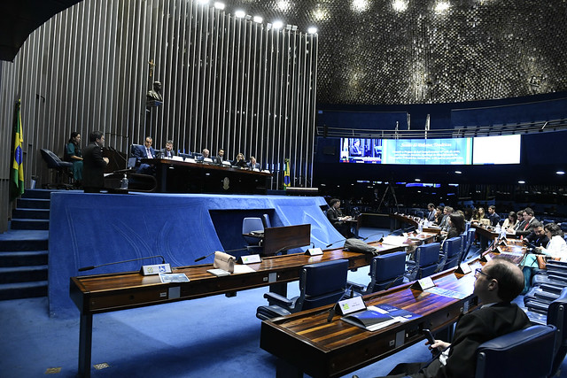 Plenário do Senado Federal durante sessão de debates temáticos sobre o Projeto de Lei Complementar (PLP) 178/2021, que institui o Estatuto Nacional de Simplificação de Obrigações Tributárias Acessórias. O projeto tem o objetivo de simplificar o sistema tributário e facilitar o cumprimento das obrigações do contribuinte.