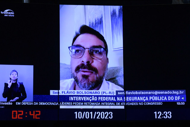Em pronunciamento via videoconferência, senador Flávio Bolsonaro (PL-RJ).