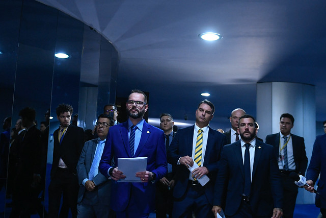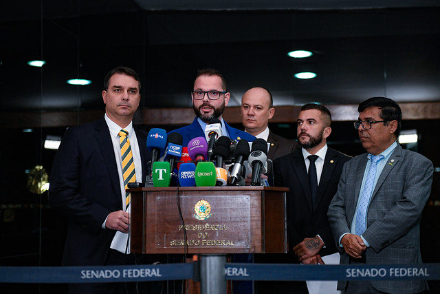 Senador Jorge Seif (PL-SC) e deputado Carlos Jordy (PL-RJ) realizam coletiva de imprensa para falar sobre o protocolo de pedido de investigação conjunta (senadores e deputados federais) do ministro do Supremo Tribunal Federal (STF), Luís Roberto Barroso, por declarações que ferem a Lei 1.079/50, em seu artigo 39, que prevê os crimes de responsabilidade por parte de membros da Suprema Corte. A coletiva também conta com a presença de diversos parlamentares signatários da ação.