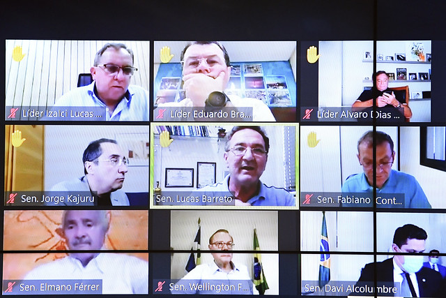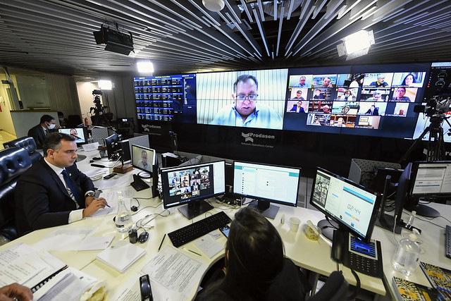 Sessão Deliberativa Remota (SDR) do Senado Federal realizada a partir da sala de controle da Secretaria de Tecnologia da Informação (Prodasen).