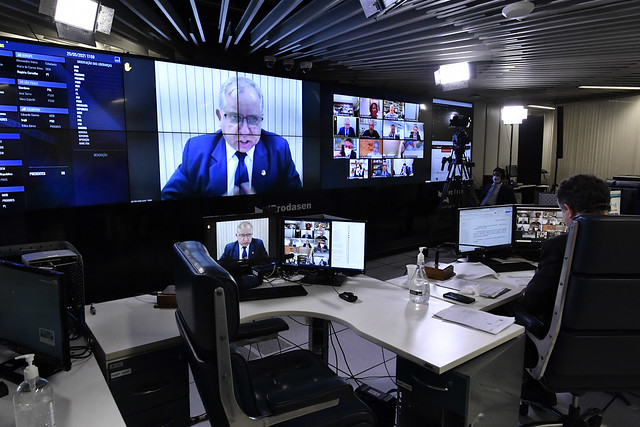 Sessão Deliberativa Remota (SDR) do Senado Federal realizada a partir da sala de controle da Secretaria de Tecnologia da Informação (Prodasen).