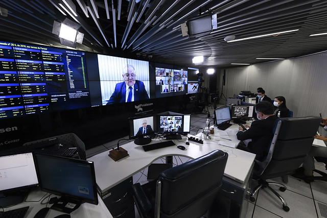 Sessão Deliberativa Remota (SDR) do Senado Federal realizada a partir da sala de controle da Secretaria de Tecnologia da Informação (Prodasen).
