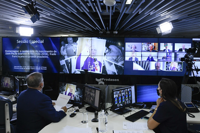 Sessão especial remota, realizada a partir da sala de controle da Secretaria de Tecnologia da Informação (Prodasen), destinada a homenagear o centenário de nascimento de Dom Paulo Evaristo Arns (1921-2016), frade franciscano e cardeal brasileiro.