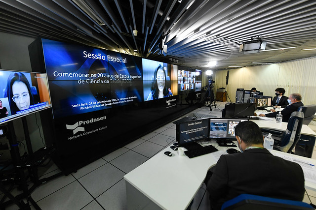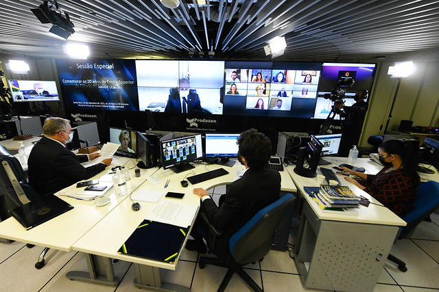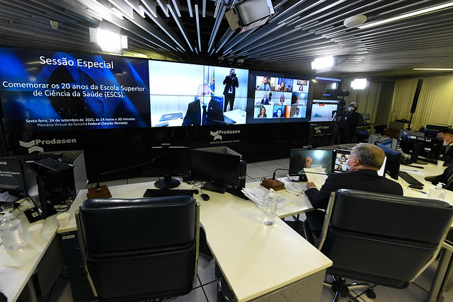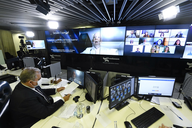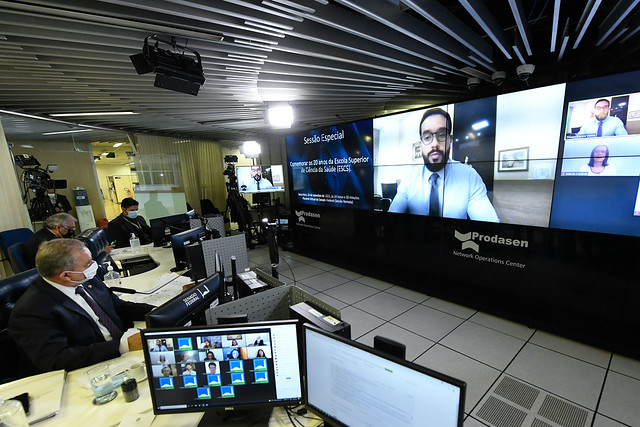 Sessão especial remota, realizada a partir da sala de controle da Secretaria de Tecnologia da Informação (Prodasen), destinada a comemorar o 20º aniversário da Escola Superior de Ciências da Saúde do Distrito Federal (ESCS).