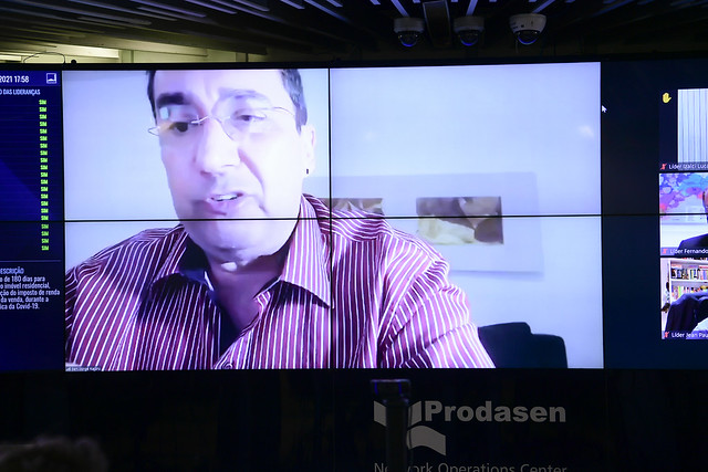 Sessão Deliberativa Remota (SDR) do Senado Federal realizada a partir da sala de controle da Secretaria de Tecnologia da Informação (Prodasen).
