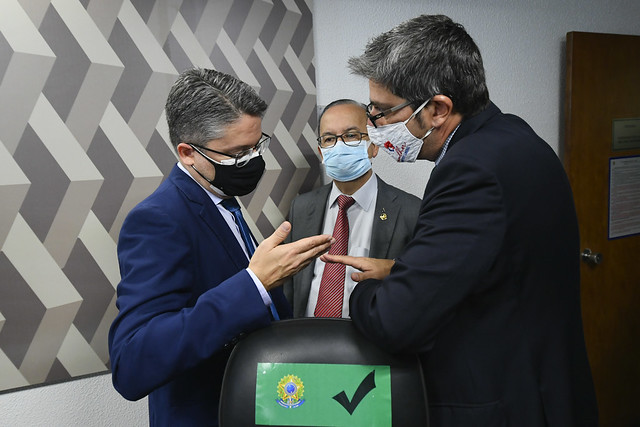 Os senadores Jorginho Mello (PL-SC), Marcos Rogério (DEM-RO) e Luis Carlos Heinze (PP-RS) conversam com a imprensa sobre a aprovação dos requerimentos e destacaram a importância de se investigar estados e municípios que receberam dinheiro do governo federal onde há indícios de irregularidades e uso incorreto de recursos públicos.