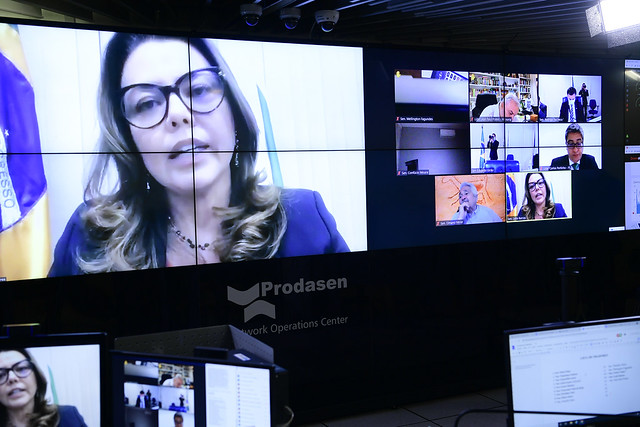 Sessão Deliberativa Remota (SDR) do Senado Federal realizada a partir da sala de controle da Secretaria de Tecnologia da Informação (Prodasen).
