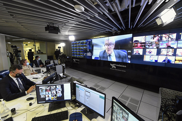 Sessão Deliberativa Remota (SDR) do Senado Federal realizada a partir da sala de controle da Secretaria de Tecnologia da Informação (Prodasen).