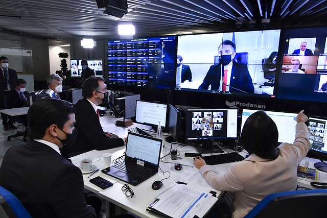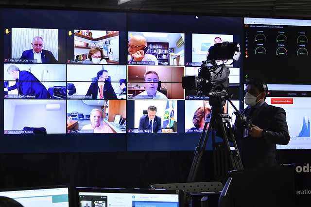 Sessão Deliberativa Remota (SDR) do Senado Federal realizada a partir da sala de controle da Secretaria de Tecnologia da Informação (Prodasen).