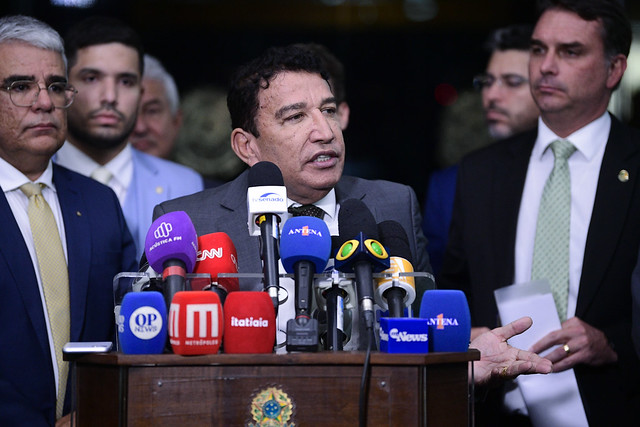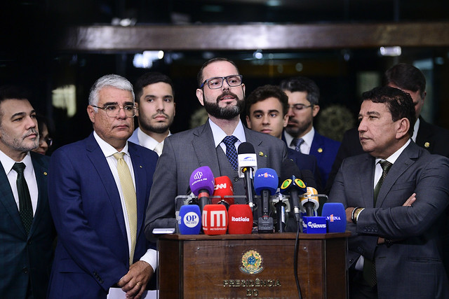 Parlamentares que representam a oposição na CPMI do dia 8 de janeiro falam com jornalistas sobre apresentação de Representação Processual Penal, impetrada contra o ministro da Justiça, Flávio Dino.