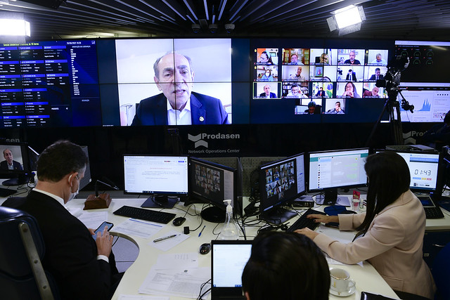 Sessão Deliberativa Remota (SDR) do Senado Federal realizada a partir da sala de controle da Secretaria de Tecnologia da Informação (Prodasen).
