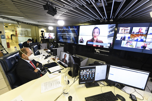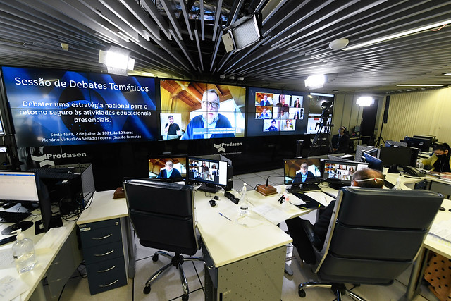 Sessão de debates temáticos, realizada a partir da sala de controle da Secretaria de Tecnologia da Informação (Prodasen), destinada a discutir uma estratégia nacional para o retorno seguro às atividades educacionais presenciais.