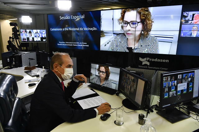 Sessão especial remota, realizada a partir da sala de controle da Secretaria de Tecnologia da Informação (Prodasen), destinada comemorar o Dia Nacional da Vacinação, celebrado pelo Brasil anualmente em 17 de outubro.