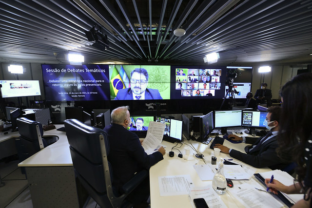 Sessão de debates temáticos, realizada a partir da sala de controle da Secretaria de Tecnologia da Informação (Prodasen), destinada a debater uma estratégia nacional para o retorno seguro às aulas presenciais.