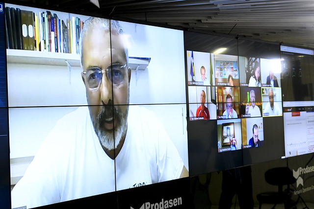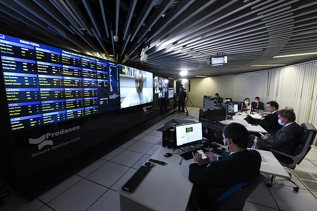 Sessão Deliberativa Remota (SDR) do Senado Federal realizada a partir da sala de controle da Secretaria de Tecnologia da Informação (Prodasen).