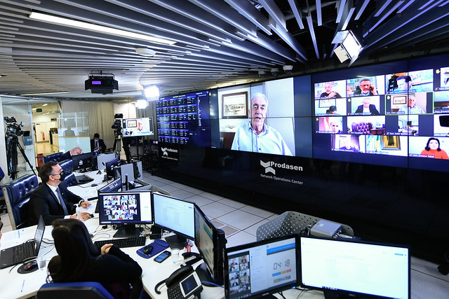 Sessão Deliberativa Remota (SDR) do Senado Federal realizada a partir da sala de controle da Secretaria de Tecnologia da Informação (Prodasen).