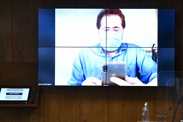 Na tela, senador Plínio Valério (PSDB-AM) em pronunciamento via videoconferência.