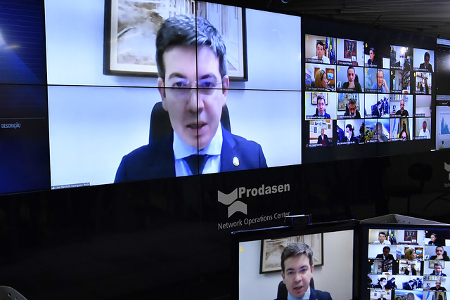 Sessão Deliberativa Remota (SDR) do Senado Federal realizada a partir da sala de controle da Secretaria de Tecnologia da Informação (Prodasen).