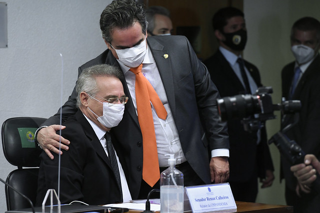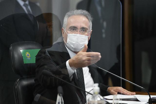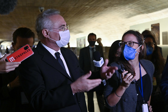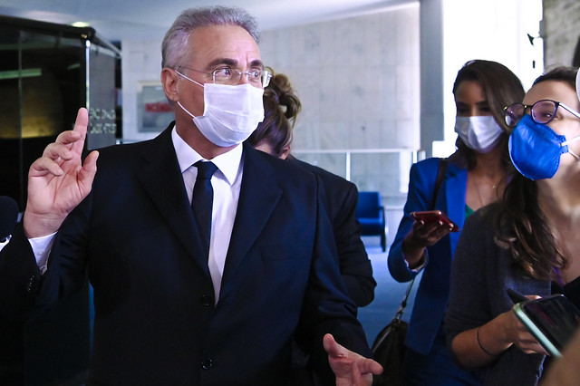Após breve suspensão da reunião da CPIPANDEMIA, o relator da comissão, senador Renan Calheiros (MDB-AL), concede entrevista.