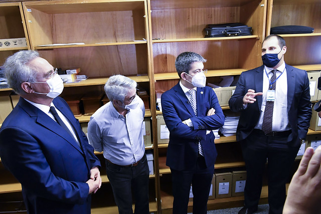 Senadores integrantes da CPI da Pandemia visitam a sala-cofre do Senado, espaço que recebe e reúne as informações requeridas pela comissão.
