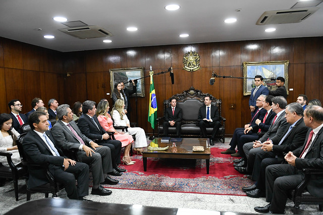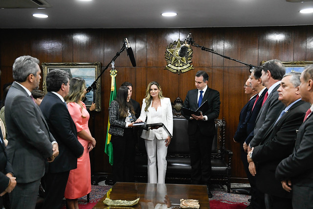 Presidente do Senado Federal dá posse a três novos senadores em cerimônia na Presidência do Senado.