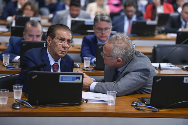 O ministro-chefe da Casa Civil, Rui Costa, e o diretor-geral da Agência Brasileira de Inteligência (Abin), Luiz Fernando Corrêa, acompanhados do senador Renan Calheiros (MDB-AL), chegam ao Senado para participar da Comissão Mista de Controle das Atividades de Inteligência (CCAI).
