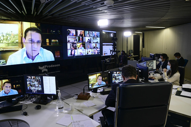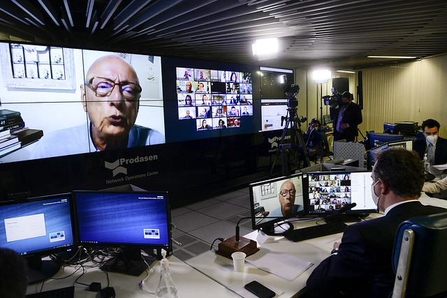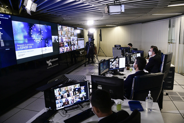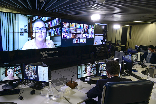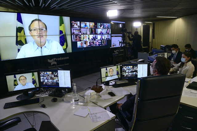 Sessão de debates temáticos, realizada a partir da sala de controle da Secretaria de Tecnologia da Informação (Prodasen), destinada a debater com representantes de instituições e empresas o fornecimento de vacinas contra covid-19 e de cilindros de oxigênio para garantir tratamento aos pacientes em estado grave.