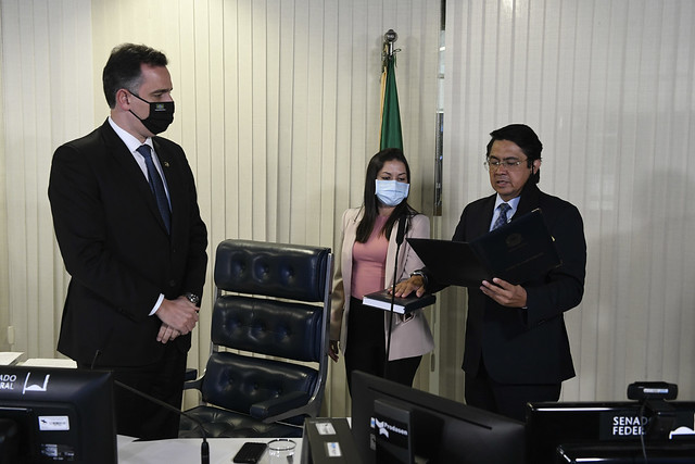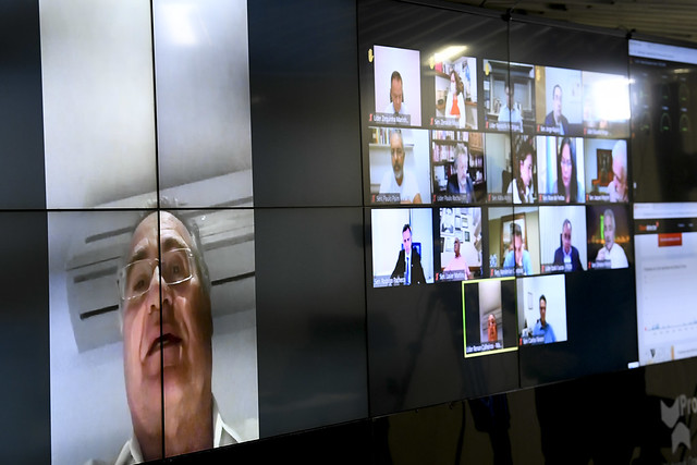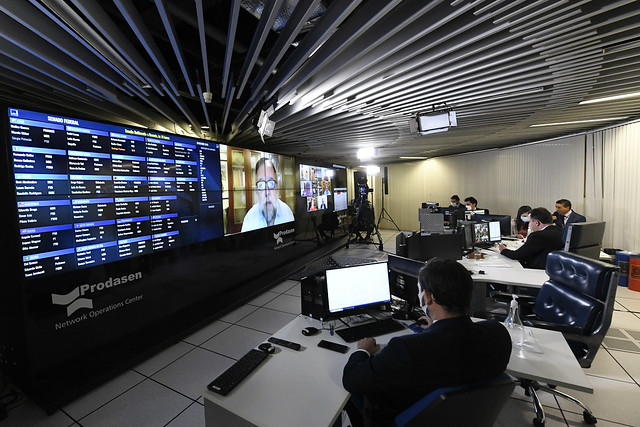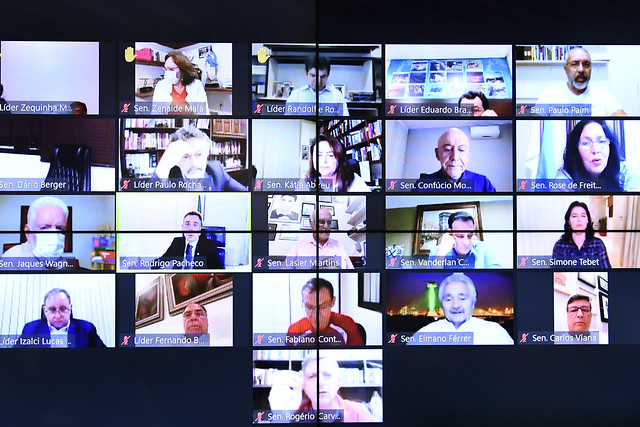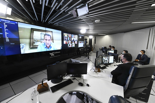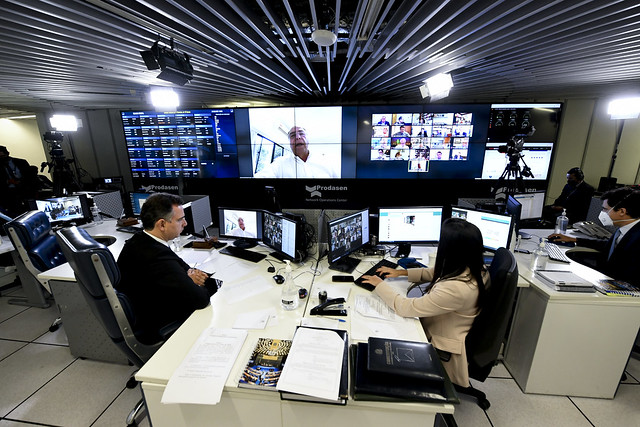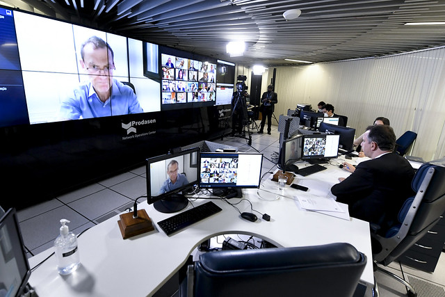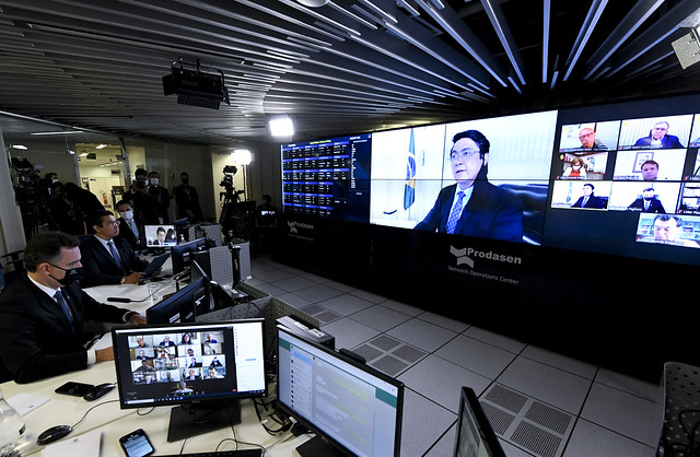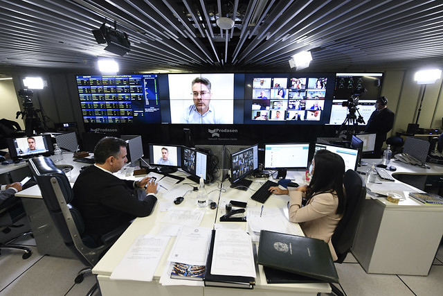 Sessão Deliberativa Remota (SDR) do Senado Federal realizada a partir da sala de controle da Secretaria de Tecnologia da Informação (Prodasen).