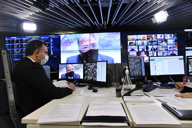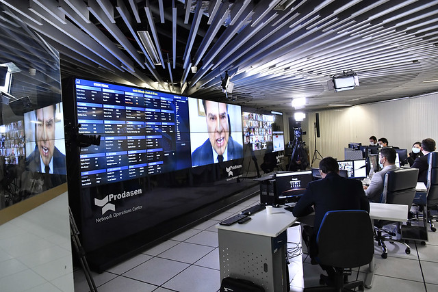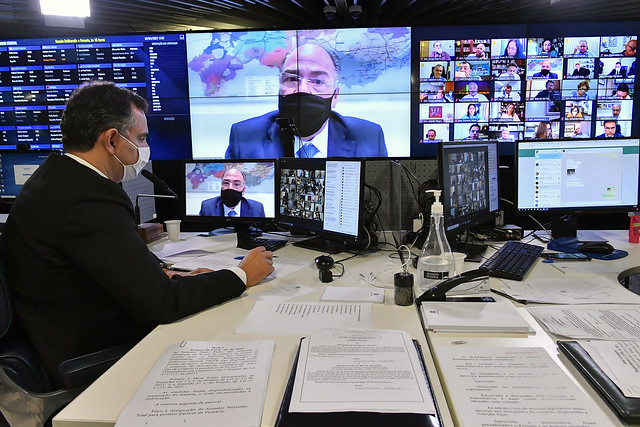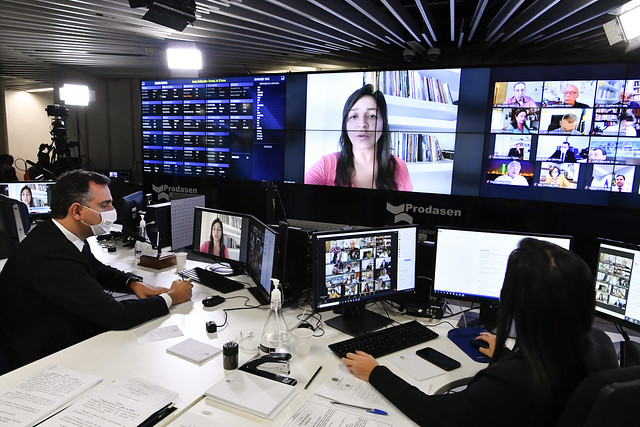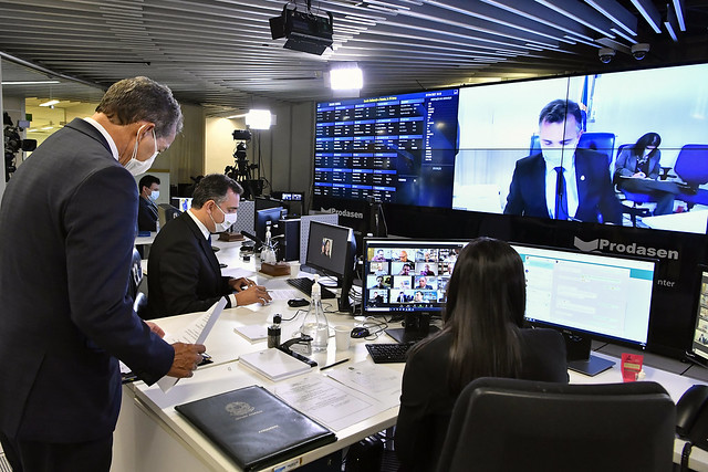 Sessão Deliberativa Remota (SDR) do Senado Federal realizada a partir da sala de controle da Secretaria de Tecnologia da Informação (Prodasen).