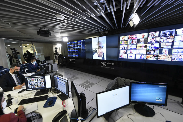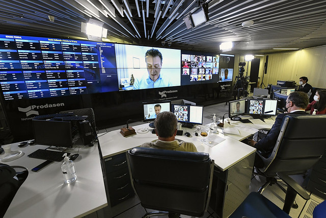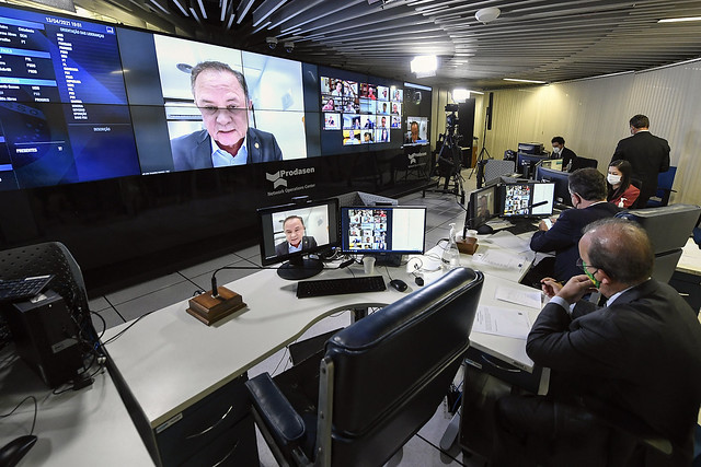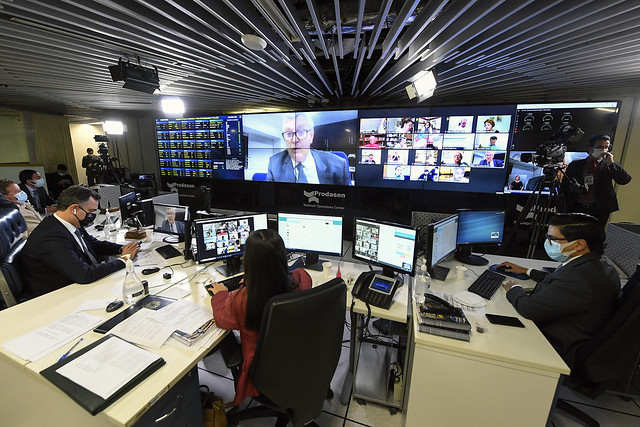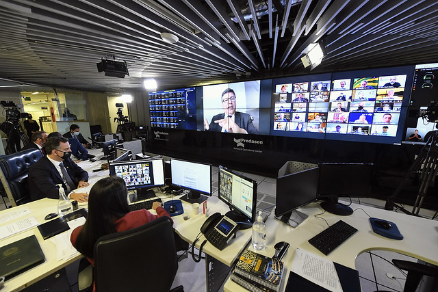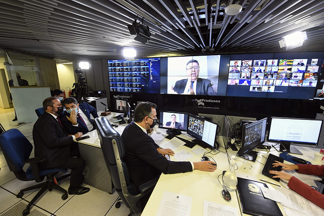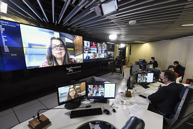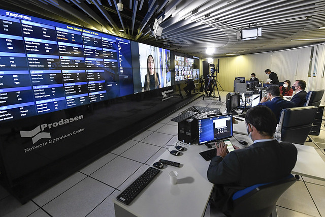 Sessão Deliberativa Remota (SDR) do Senado Federal realizada a partir da sala de controle da Secretaria de Tecnologia da Informação (Prodasen).