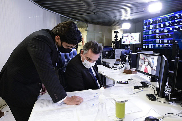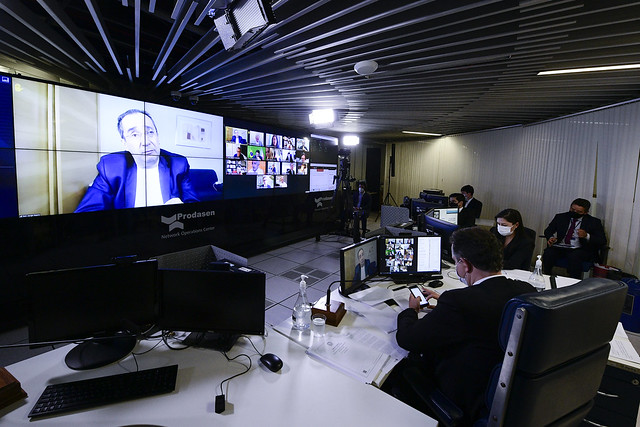 Sessão Deliberativa Remota (SDR) do Senado Federal realizada a partir da sala de controle da Secretaria de Tecnologia da Informação (Prodasen).