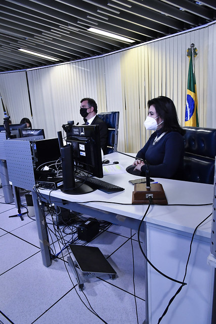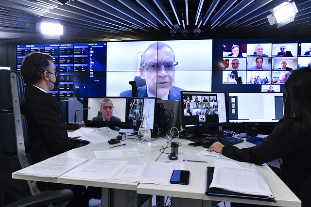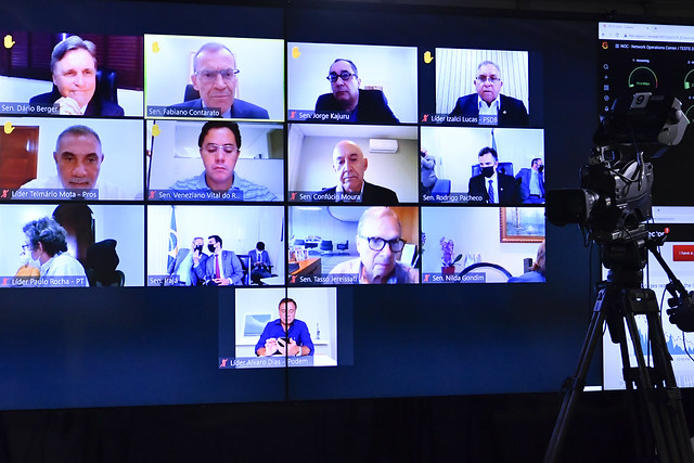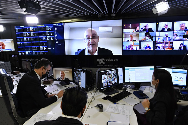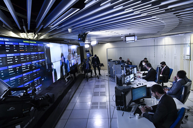 Sessão Deliberativa Remota (SDR) do Senado Federal realizada a partir da sala de controle da Secretaria de Tecnologia da Informação (Prodasen).