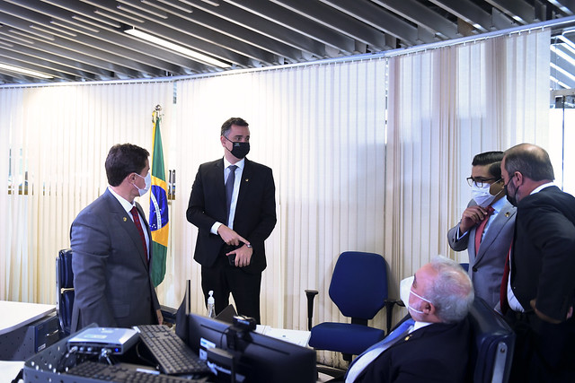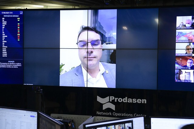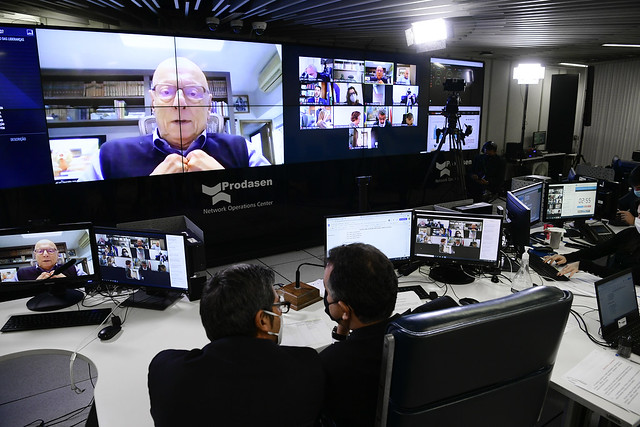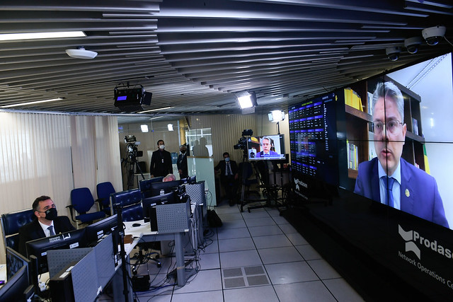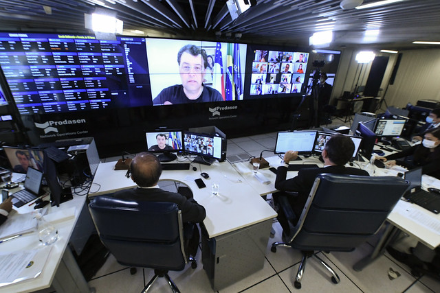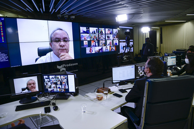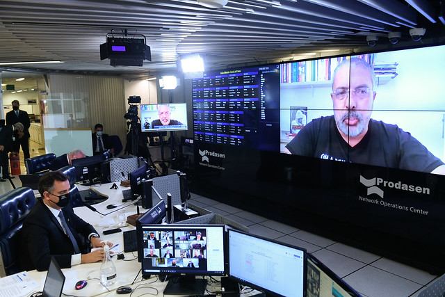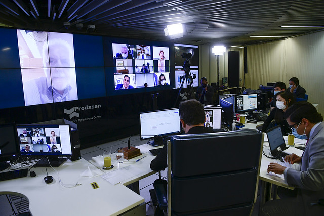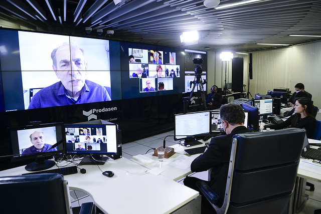Sessão Deliberativa Remota (SDR) do Senado Federal realizada a partir da sala de controle da Secretaria de Tecnologia da Informação (Prodasen).