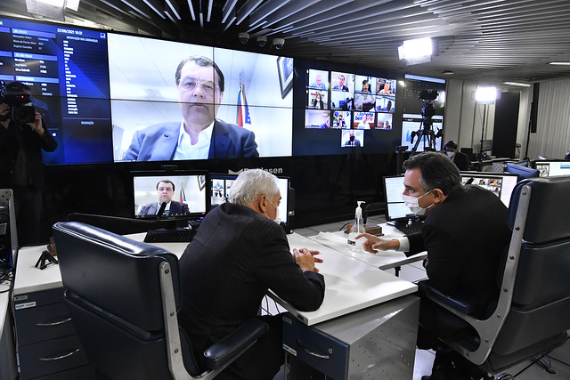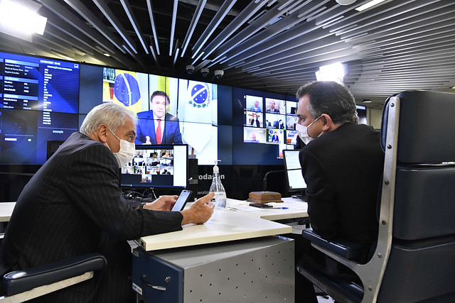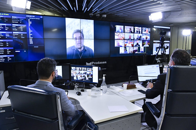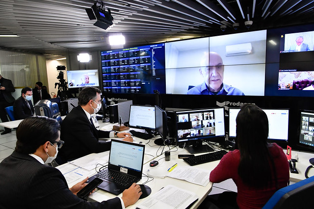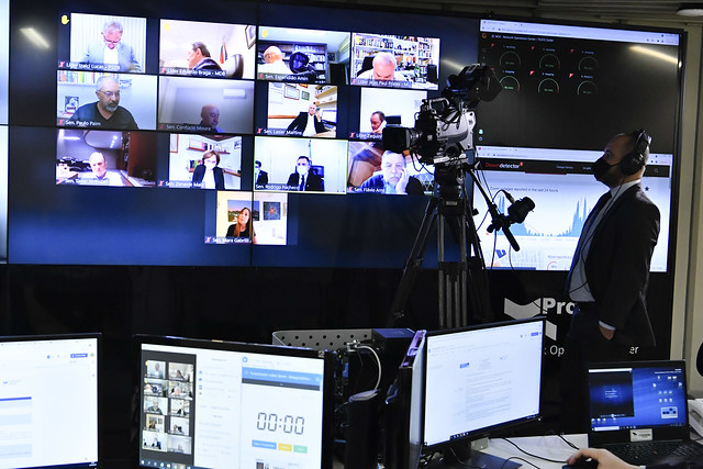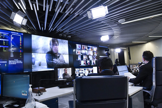 Sessão Deliberativa Remota (SDR) do Senado Federal realizada a partir da sala de controle da Secretaria de Tecnologia da Informação (Prodasen).