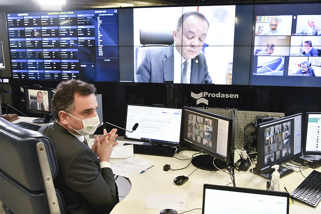 Sessão Deliberativa Remota (SDR) do Senado Federal realizada a partir da sala de controle da Secretaria de Tecnologia da Informação (Prodasen).