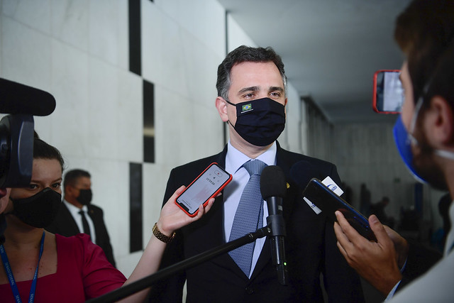 Presidente do senador Rodrigo Pacheco (DEM-MG) concede entrevista após a cerimônia de posse da nova diretoria da União Nacional dos Estudantes (UNE).